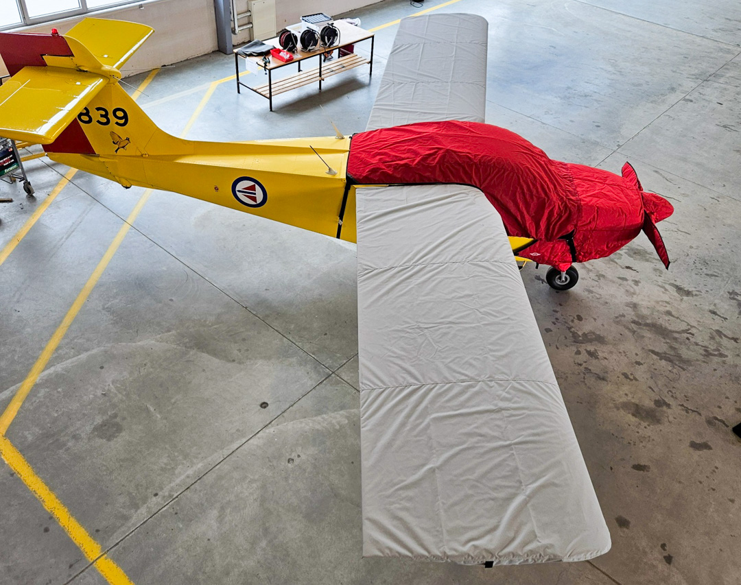 The Saab Safari MFI-15. MFI-17 Wing Covers are a perfect solution to protect your paint from sun damage and prevent winter frost, snow, ice buildup, and corrosion. They are made from Solution-Dyed Polyester or Acrylic Sunbrella and form-fit to slip around each wing tip, cover the entire upper surface of the wing and wrap around the leading and trailing edges. The covers secure under the wing with adjustable straps from the trailing edge to the leading edge. The wing covers can also attach to each other with adjustable straps at the leading and trailing edges of the wing under the belly of the plane. In some instances, cut-outs are made in the trailing edge of the wing covers to accommodate static wicks. We have the ability to also accommodate wing tip modifications, such as STOL kits, droop tips, and vortex generators. Wing covers are labeled LEFT and RIGHT for your convenience. Wing Covers are available for winter use or long-term, all-year use. A Hail Protection version can be made which incorporates very dense closed cell foam into the entire upper surface of the wing covers to help prevent hail damage. Although these covers are bulky, they do help protect your wing and control surfaces against small to medium-size hail.... leer más